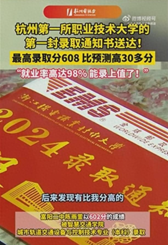 在2024年7月,一位来自浙江杭州的高考生,根据个人兴趣和未来职业规划,以602分的成绩(超过一段线110分)报考了浙江机电职业技术大学(该校最低录取分数线为532分)。这一决定在网上引起了广泛讨论,许多人似乎对这名高分考生的选择感到不解。