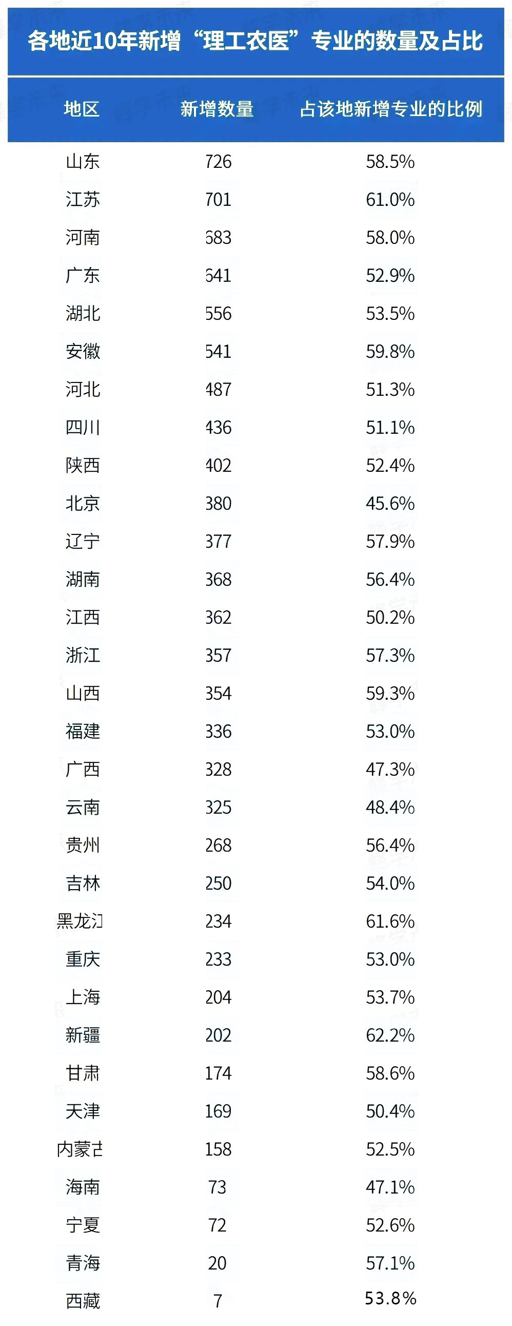 从近十年各地新增理工农医专业的数量来看,山东省以726个新增专业数量位居全国首位,占比达到58.5%。
