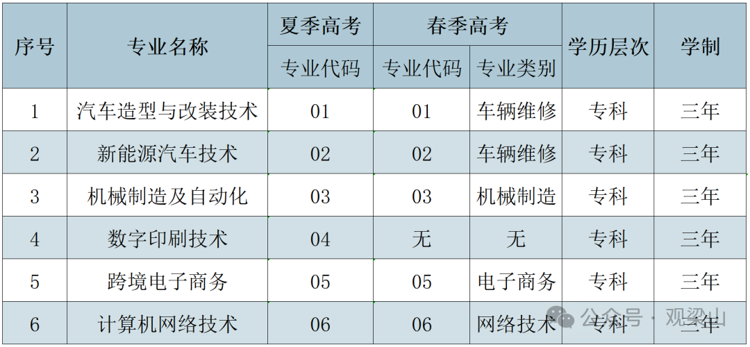 宣布有6个专业参加2025年注册入学招生,分别是:机电一体化技术、新能源汽车技术、计算机网络技术、人工智能技术应用、健康管理、社区康复、数字媒体技术、网络营销与直播电商。最终实际计划以考试院发布为准。