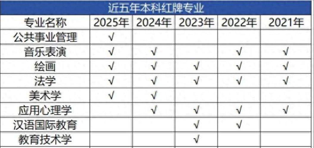 2025年本科红牌专业包括:公共事业管理、音乐表演、绘画、法学、美术学。