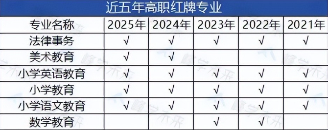 2025年高职红牌专业包括:法律事务、美术教育、小学英语教育、小学教育、小学语文教育。