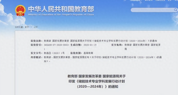2020年1月,教育部、国家发展改革委、国家能源局联合印发《储能技术专业学科发展行动计划(2020—2024年)》,计划明确要求加快培养储能领域“高精尖缺”人才,增设若干储能技术本科专业、二级学科和交叉学科。