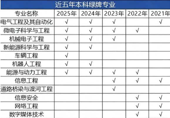 近五年被列为本科绿牌专业次数最多的专业是电气工程及其自动化、微电子科学与工程(上榜4次);其次是机械电子工程、能源与动力工程、信息工程均(上榜3次);车辆工程为首次上榜。其中,多次出现的电气工程及其自动化属于电气类,微电子科学与工程属于电子信息类。