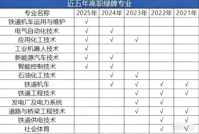 近五年被列为高职绿牌专业次数最多的专业为铁道机车(上榜4次);其次是应用化工技术、道路与桥梁工程技术、铁道工程技术均(上榜3次);工业机器人技术、铁道机车运用与维护均为首次上榜。
