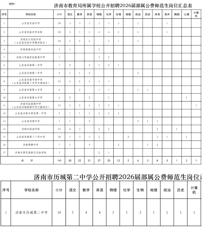日前、济南市公示教育局所属学校公开招聘2026届部属公费师范生就业岗位。