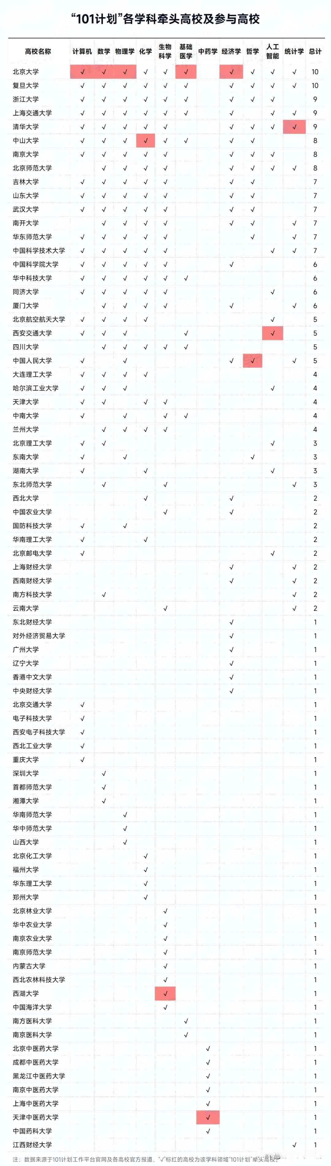 目前,“101计划”已经从最初试点的计算机科学领域推广至数学、物理学、化学、生物科学、基础医学、中药学、经济学、哲学、人工智能、统计学,共11个领域。根据“101计划工作平台”官方媒体公布的信息显示,11个学科领域共有79所高校入选。